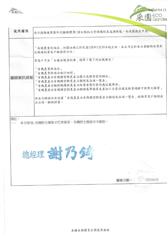 品 名 : 有機紫米米穀粉 原料名稱 : 有機紫糙米 淨 重 : 20公克*15包 產地 : 台灣花蓮 保存期限:12個月 製造日期:依包裝所示